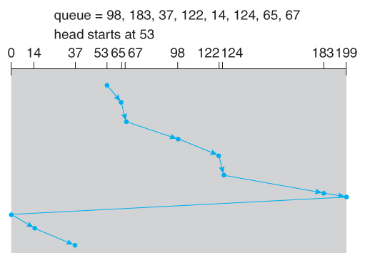 Circular-SCAN,通过循环队列方式来改进 SCAN :一旦磁臂到达磁盘的末端,它会返回到另一端而不处理任何请求,然后从磁盘的开头重新开始: